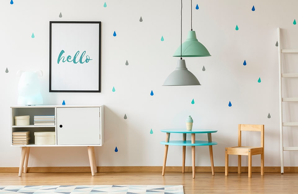 Consigliamo quindi di declinare la stanza sui grigi, combinandovi del bianco e del legno naturale, e scegliendo poi un colore più deciso (il verde, il giallo, il rosso, il rosa, il blu) per alcuni elementi da far spiccare. Ad esempio sedie, cuscini, stampe, biancheria, lampadari, cesti per i giocattoli.