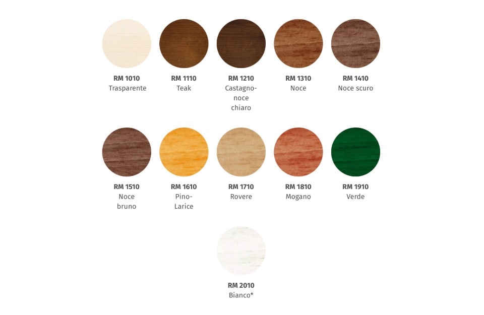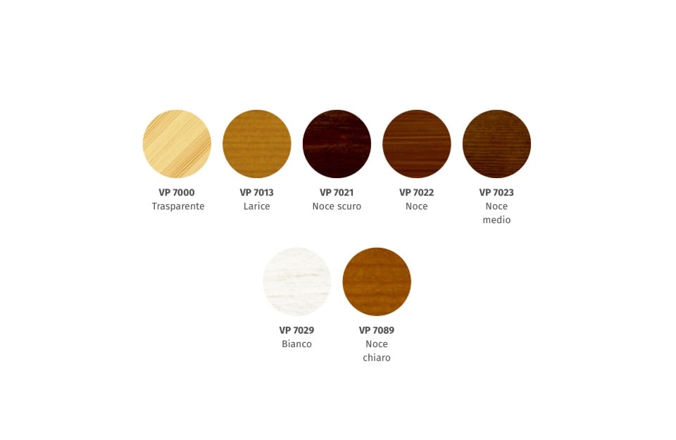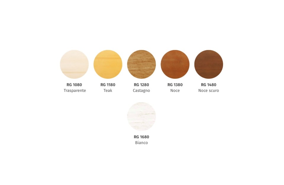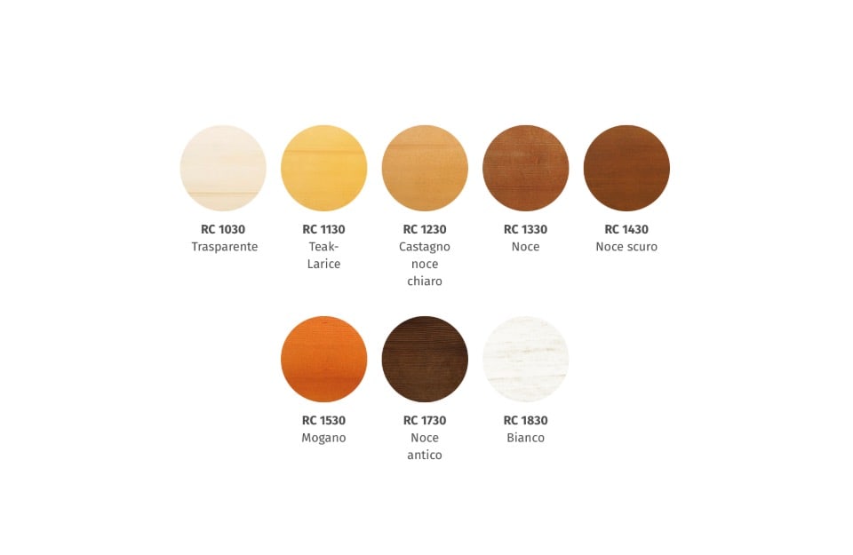 Nell’impregnante all’acqua gel: trasparente, teak, castagno, noce, noce scuro, mogano e bianco.