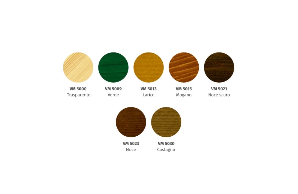 L’impregnante a solvente classico: trasparente, verde, larice, mogano, noce scuro, noce e castagno.