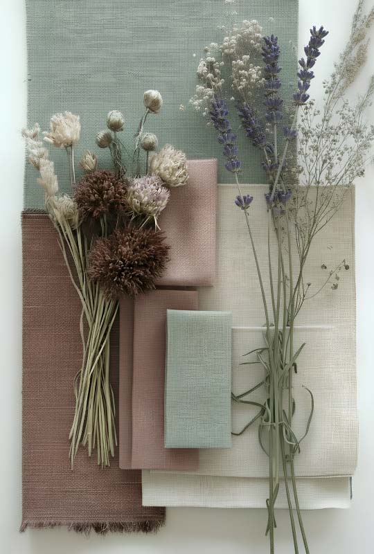 Le tonalità si ispirano ai colori della terra, del vino e dei fiori secchi. È lo stile di chi ama la natura e la lentezza, di chi sogna una casa che profuma di pane e glicine.