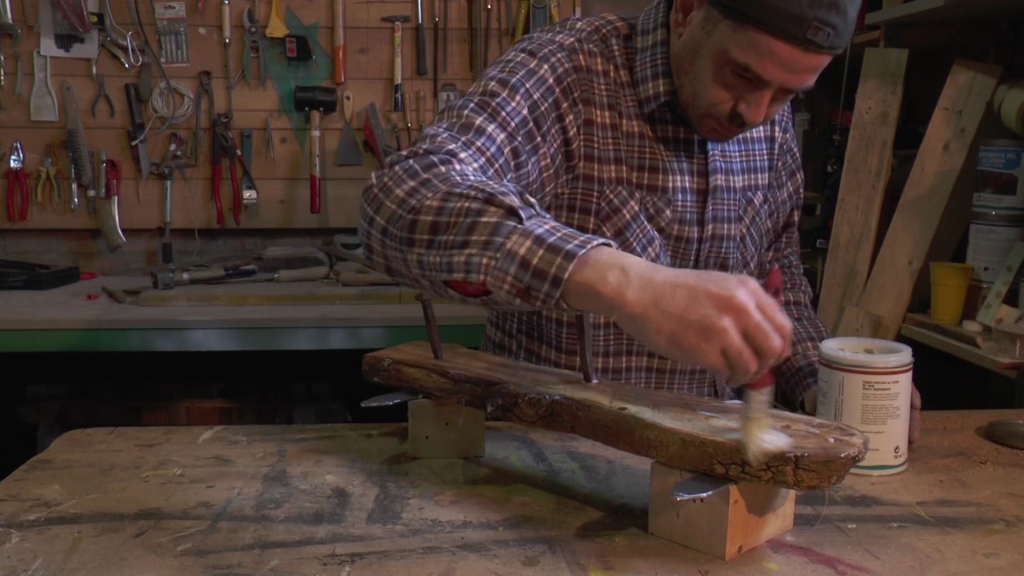 - Prendiamo il fondo finitura all’acqua opaco trasparente ( RP 4060) e verniciamo il legno in tutte le sue parti (corteccia e chiodi compresi).