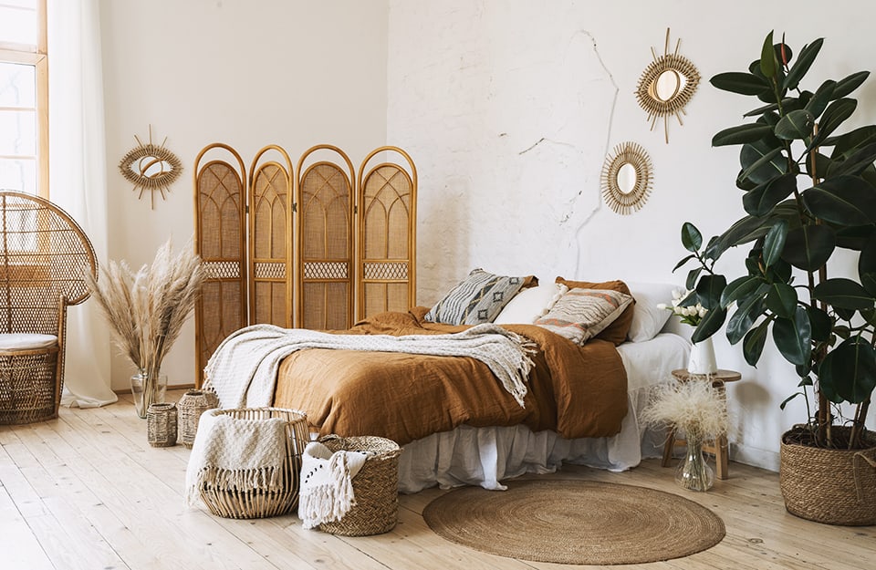 Altro esempio di camera da letto, in questo caso con numerosi elementi in vimini e rattan, specchi a forma di occhio, coperte dai colori caldi e ovviamente qualche pianta.