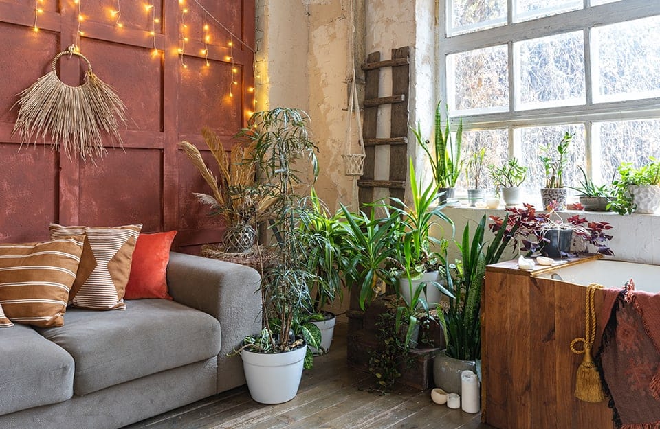 Un salotto in stile Boho Chic. Un angolo pieno di verde proprio sotto a una grande finestra. I vasi sono di diversi tipi.