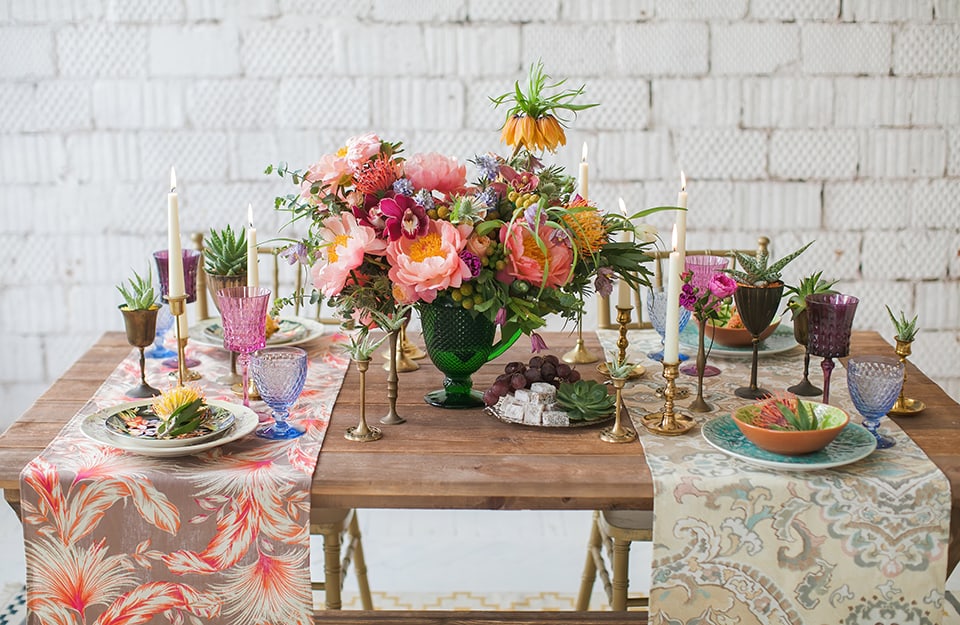 Tavolo da pranzo apparecchiato in stile Boho Chic, con piatti differenti e di diversi colori, così come i bicchieri. Due variopinti runner decorano il tutto, insieme a candele e molti fiori.