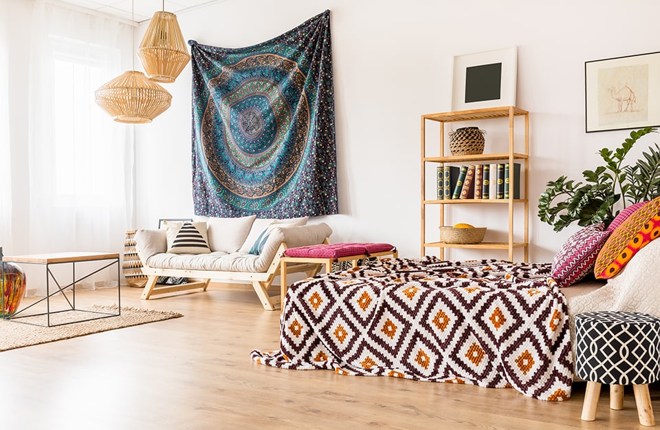 Cuscini, tappeti, tessuti etnici, pouf, divani comodi, accessori vintage, stampe, quadri, soprammobili, sculture, candele, acchiappasogni, arazzi, piatti dipinti: le opzioni sono potenzialmente infinite, in una sorta di “caos” organizzato che mantenga un certo equilibrio.