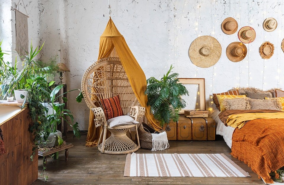 In camera da letto si possono creare angoli insoliti, come una sedia in vimini o rattan sormontata da una tenda. Un vecchio baule diventa un comodino. Dei cappelli di paglia sono appesi alle pareti come fossero quadri. Dei fili di luci a led illuminano l’ambiente dai colori caldi e accoglienti.