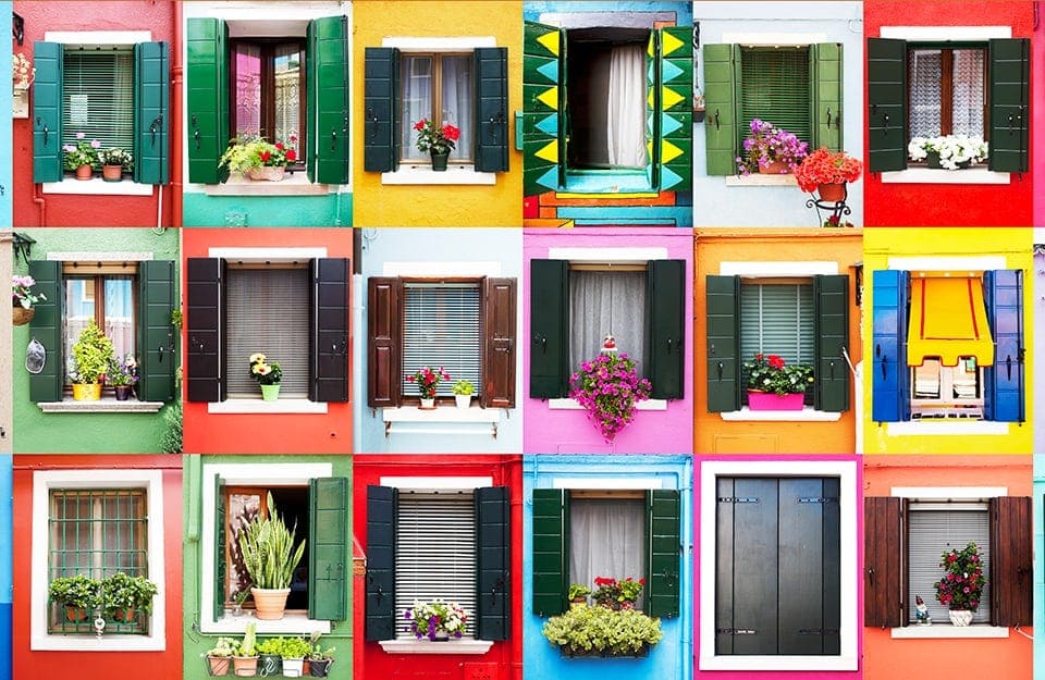 Composizione che mostra 18 diverse finestre delle coloratissime case dell'isola di Burano, a Venezia
