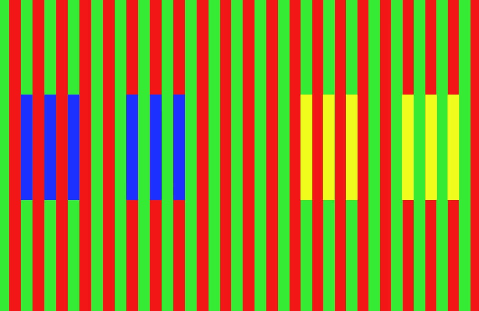Nell’immagine qui sopra, ad esempio, i blu e i gialli sono esattamente gli stessi ma sembrano differenti quando li troviamo sulle colonne rosse rispetto a quelli che vediamo nelle colonne verdi.