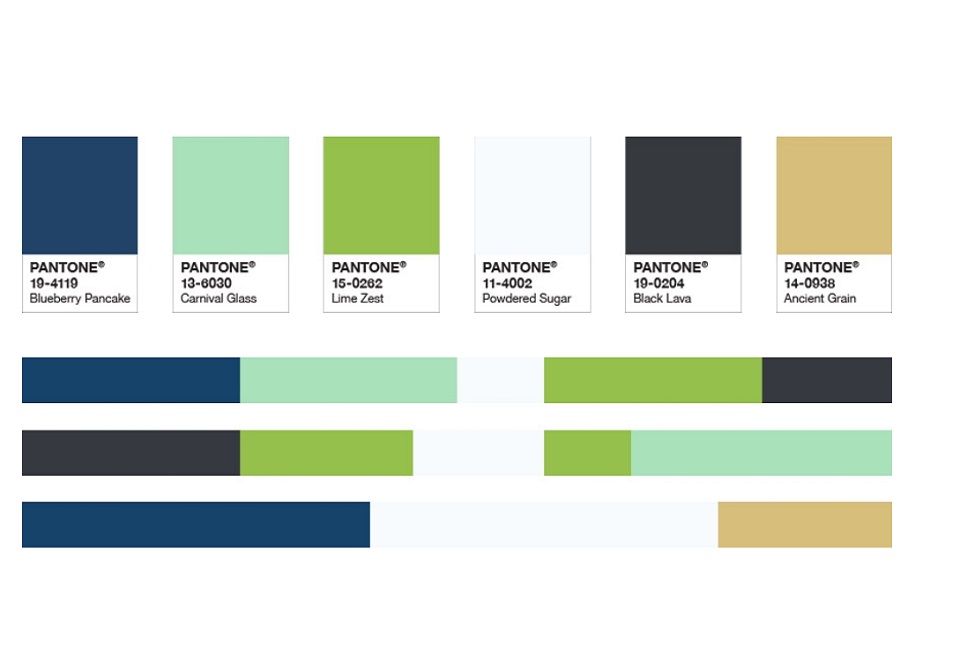 - La prima è “Embracing Nature” ed è composta da Blueberry Pancake, Carnival Glass, Lime Zest, Powdered Sugar, Black Lava, Ancient Grain. In questa palette, il candido bianco Powdered Sugar illumina le fredde tonalità blu e verdi della natura con un aspro e pungente Lime Zest, che assicura al complesso un’esplosione di freschezza.