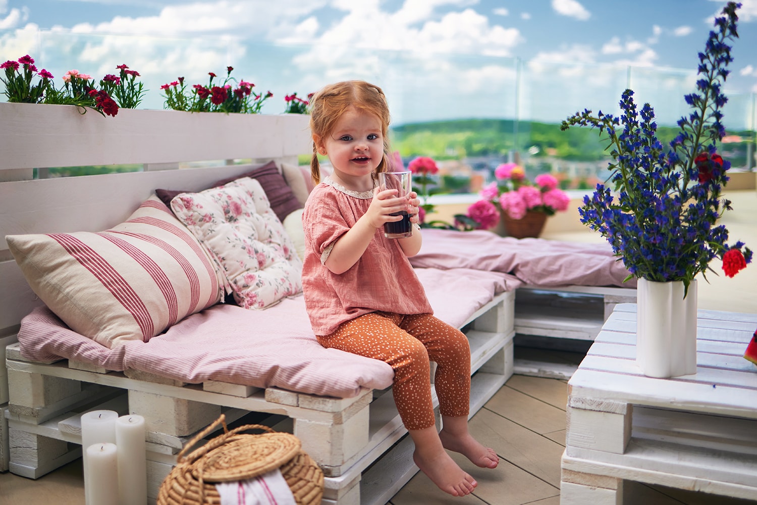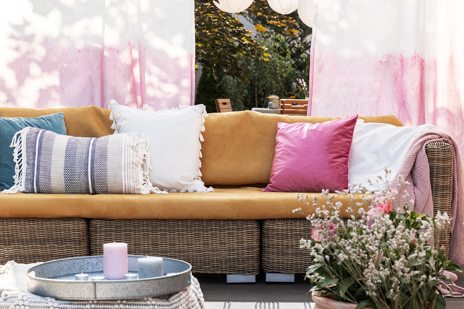 Si può osare con tinte audaci e vibranti. E fare accostamenti azzardati: dipingere di giallo un tavolino, creare cuscini con scampoli di stoffa multicolore, riempire la ringhiera di fiori dalle tinte vivaci.