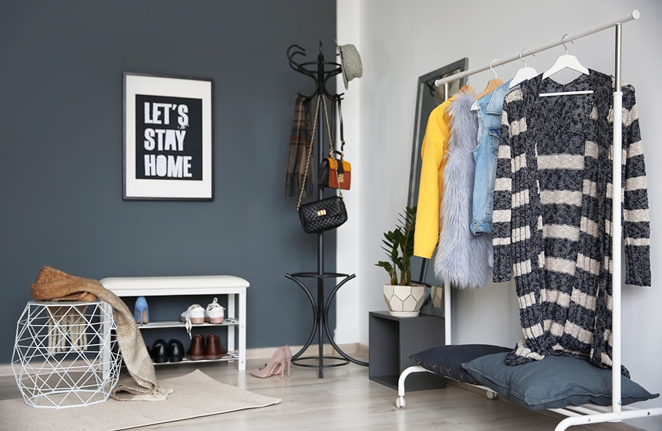 Non è necessario che si tratti di un’area di grandi dimensioni. Basta un armadietto all’ingresso, o dei ripiani. E un dispositivo di separazione: meglio una porta ma vanno bene anche tende e separé.