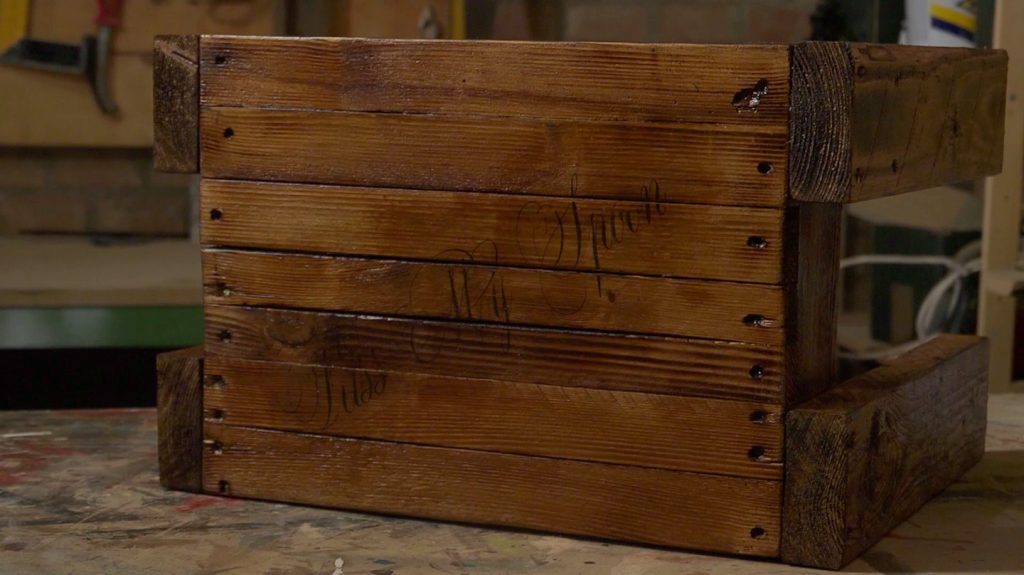 - Prendiamo le tavole di bancale e fissiamole ai 4 lati del mini pallet con le viti per legno (vedi video). Possiamo agevolare questa operazione tenendo ferme le tavole contro il bancale con l’aiuto di un morsetto.
