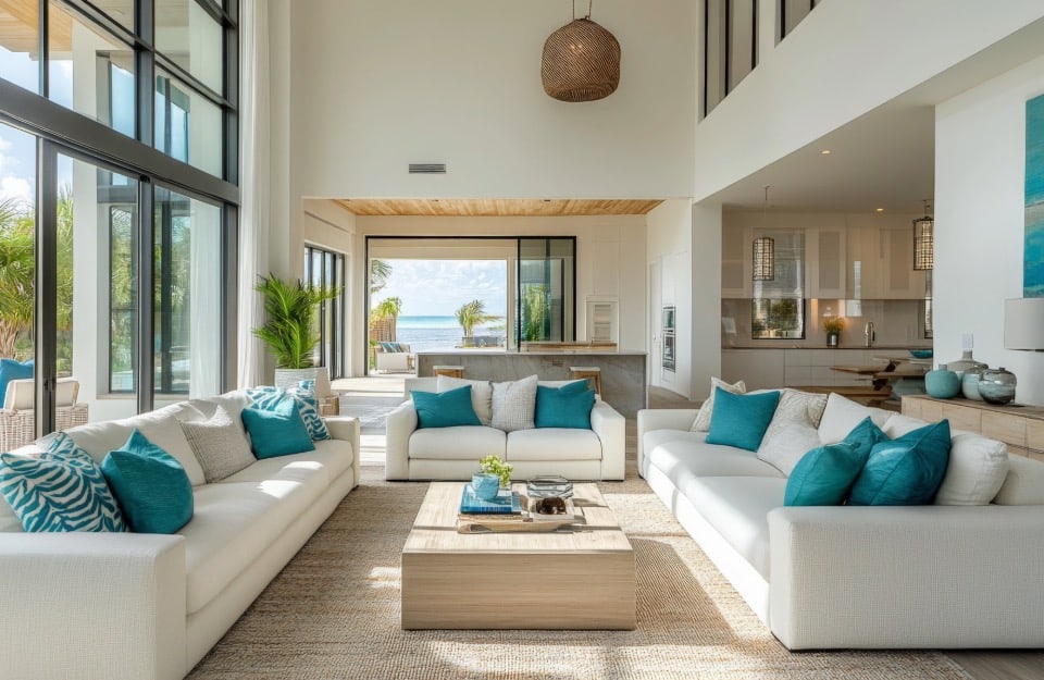 - tonalità neutre: beige, grigio chiaro e tortora smorzano l’energia del turchese, rendendolo più adatto a spazi sofisticati come soggiorni o studi;