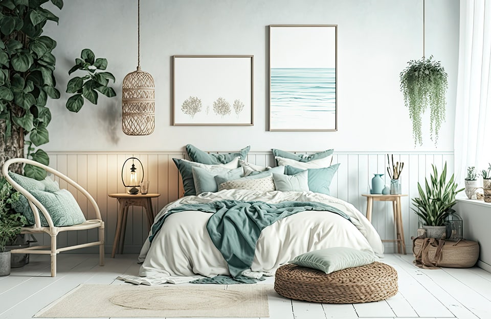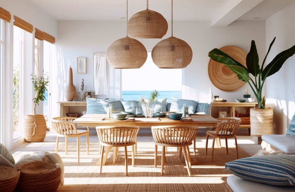 - Illuminazione: la luce naturale deve essere la protagonista assoluta, enfatizzata attraverso l’uso di finestre ampie e tende leggere. Lampade in vetro trasparente o in rattan possono essere utilizzate per illuminare gli spazi in modo delicato.
