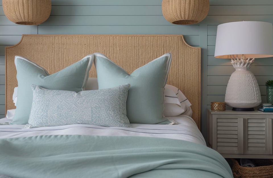 La testiera del letto richiama i lampadari in vimini mentre i colori dei tessuti strizzano l’occhio all’azzurro pastello della parete.