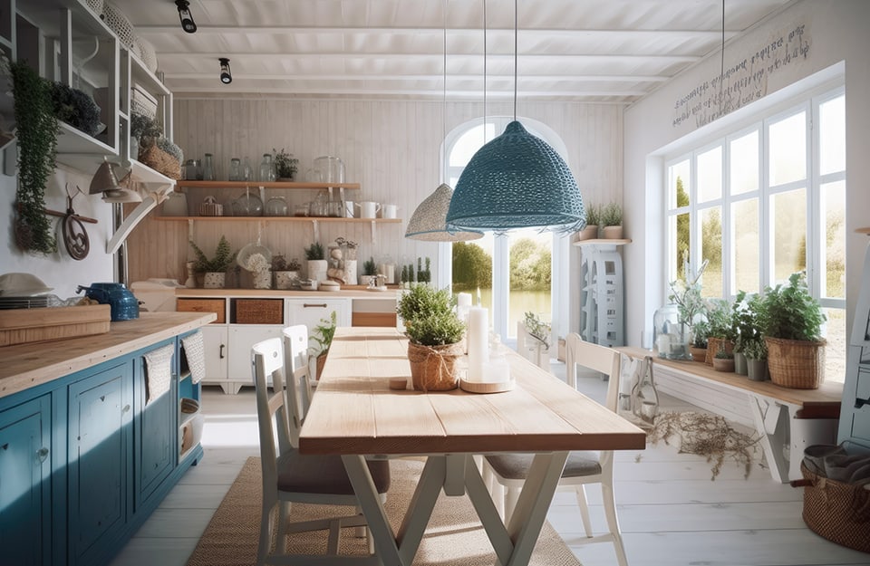 Una cucina in stile coastal è un mix perfetto di rusticità ed eleganza. Il colore dominante è il bianco, abbinato ai toni del blu dei mobili da cucina e del lampadario, e al legno naturale.