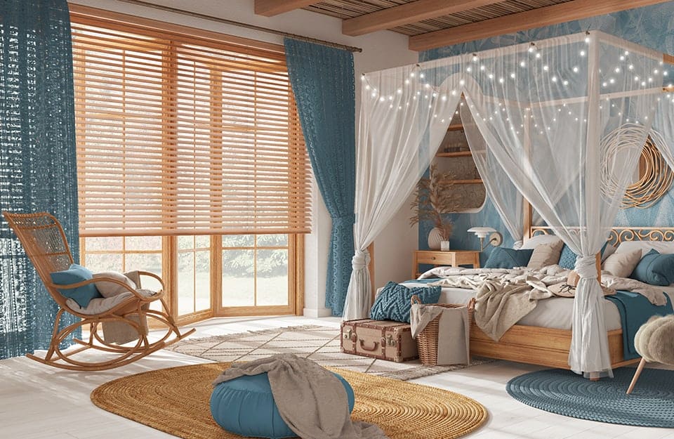 In camera da letto si può azzardare con un letto a baldacchino e una poltrona in vimini. In questo caso i toni del blu sono applicati alle pareti e ai tessuti.