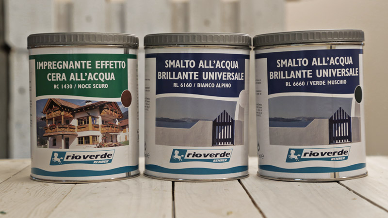 - vernici per legno: RC 1430 Impregnante effetto cera all’acqua (noce scuro), RL 6160 Smalto all’acqua brillante universale (bianco alpino), RL 6660 Smalto all’acqua brillante universale (verde muschio)