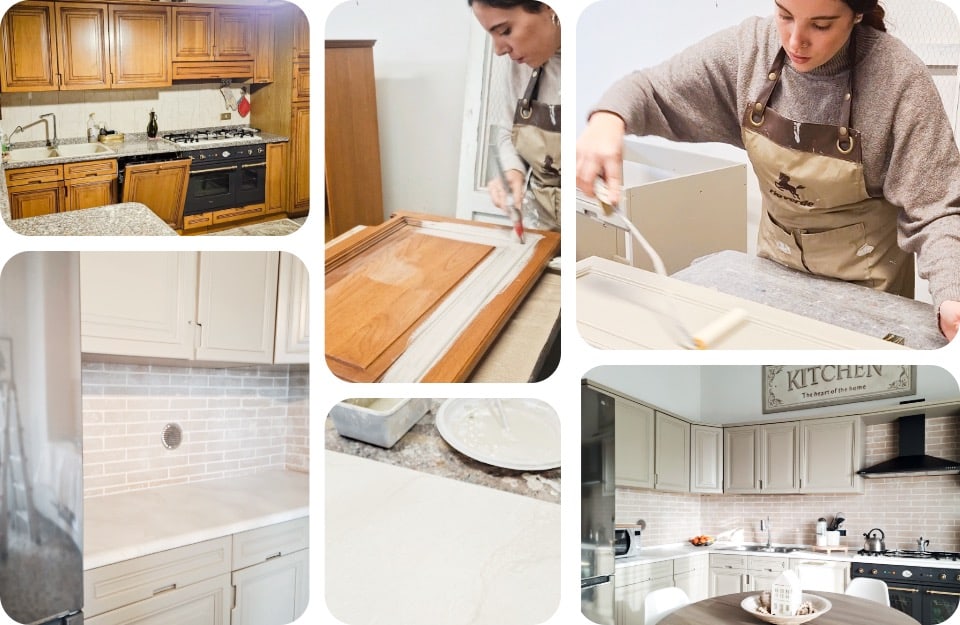 Trattandosi di una cucina in rovere, per le parti in legno, dopo aver preparato la superficie, ho proceduto con un trattamento apposito per evitare la risalita di tannino usando il Fondo turapori RP 1060 catalizzato. Lasciate passare dodici ore, ho potuto dare due mani di vernice utilizzando rullo e pennello. Ho utilizzato il color Marzapane della linea Vintage Prestige, modificando per ottenere una sfumatura più calda. Il bello di questo prodotto è che non si vedono aloni, ed è possibile realizzare una buona laccatura anche non a spruzzo.