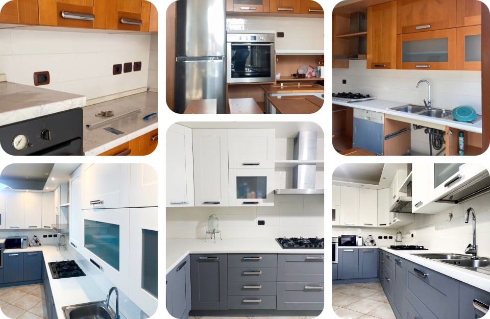 «In questo progetto mi è stato chiesto di ridipingere una vecchia cucina acquistata insieme ad un appartamento. I clienti hanno deciso di lasciare la cucina esistente in quanto molto ben tenuta, ma il colore non rientrava nel gusto moderno con cui volevano arredare la casa.