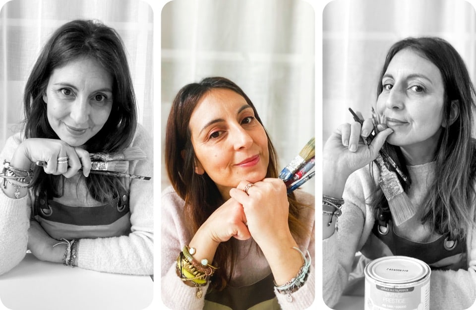 Si è innamorata a prima vista di Vintage Prestige, per le sue innumerevoli possibilità di utilizzo. È una vernice molto corposa e con la quale si possono creare bellissimi effetti materici, ma che può trasformarsi, se diluita bene, in una vernice liscia e setosa perfetta per effetti laccati. Inoltra è applicabile ovunque: lei l’ha usata anche sul pavimento di casa, ma per questo esiste in realtà una vernice perfetta — la Floor Prestige — che è studiata appositamente per i pavimenti.