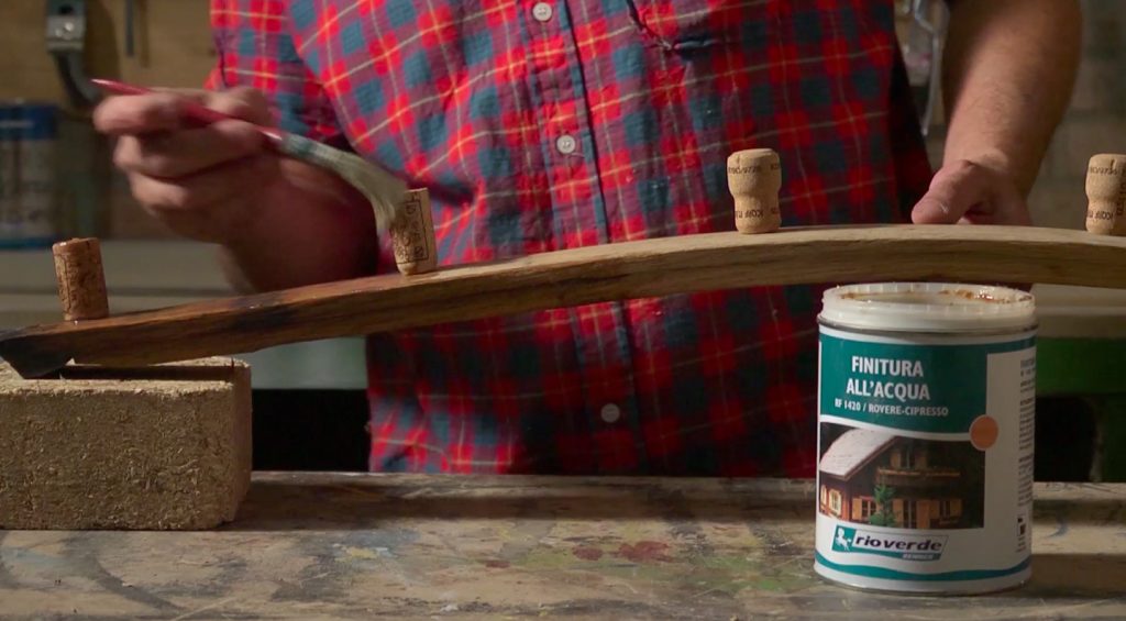 - Prendiamo la Finitura all’acqua Rovere-Cipresso (RF 1420) e verniciamo per bene tutta la doga.