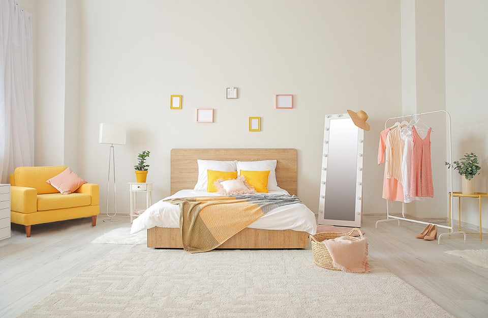 Qualche accento di rosso — ma senza esagerare, ad esempio su cornici e tessuti — andrà benissimo. Lo stesso vale per il giallo limone o una tinta più tenue come il giallo perla.