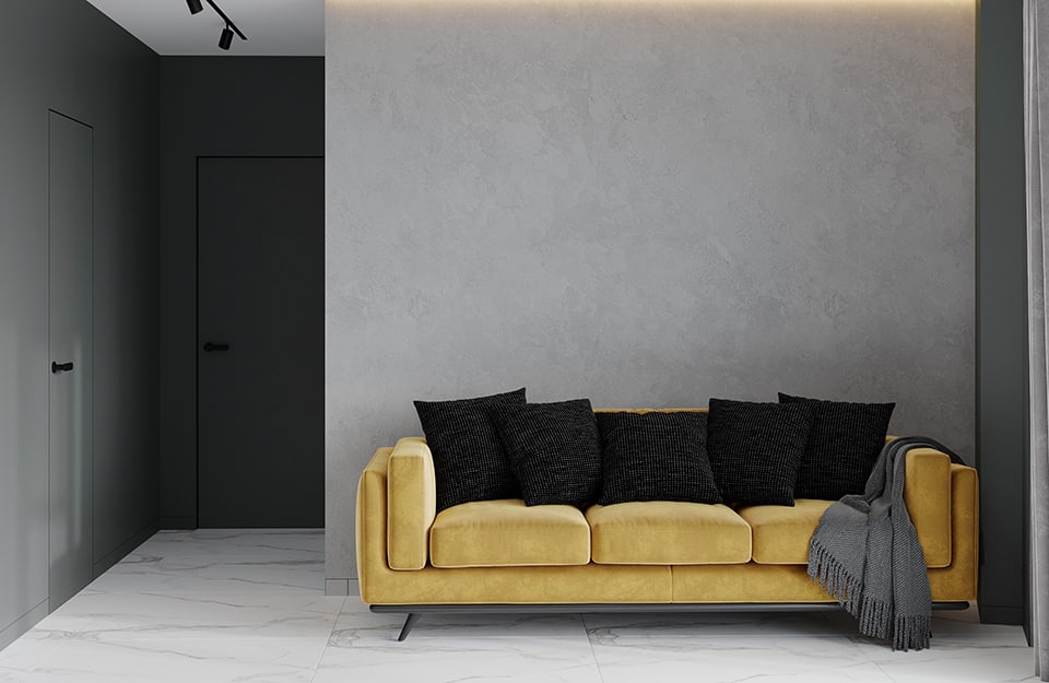 Un sofà senape si integra perfettamente con i toni del tortora chiaro e dei grigi.
