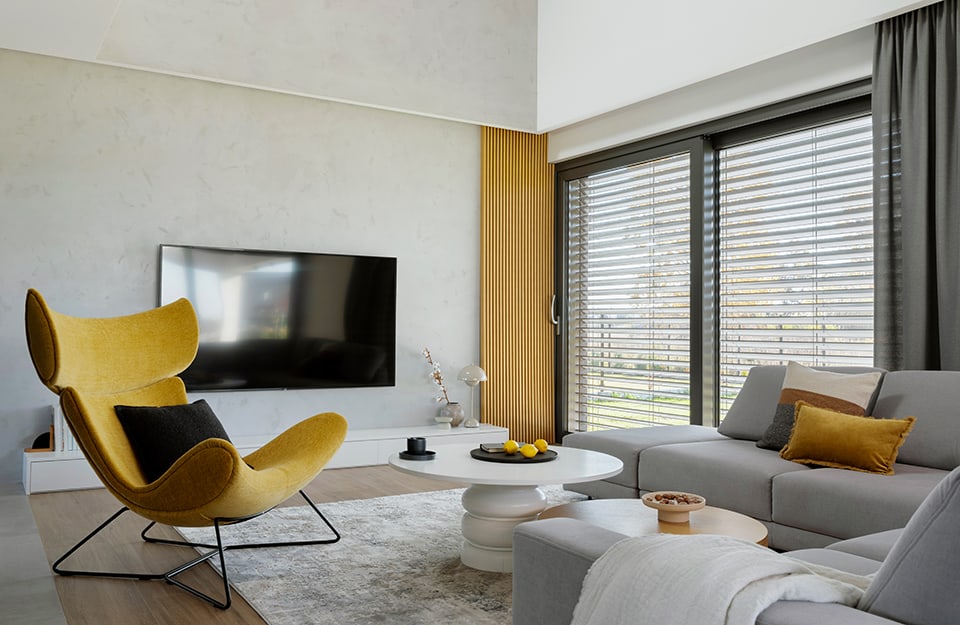 Non solo sofà: anche una poltrona color senape, specialmente se abbinata a sedute sui toni del grigio, può diventare l’elemento chiave per una stanza ben equilibrata.