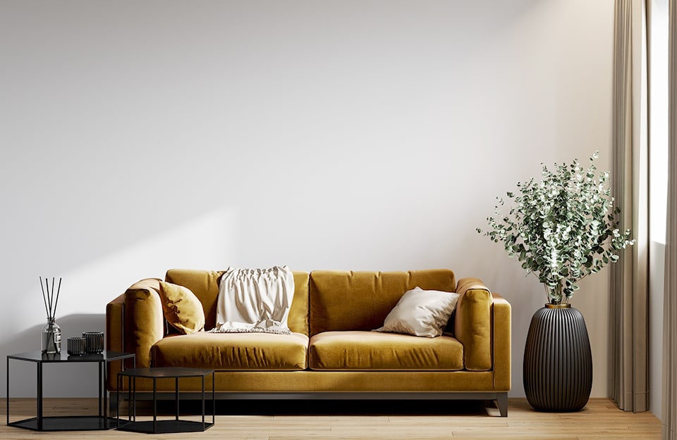 Anche in una stanza piuttosto spoglia, un divano senape è in grado di arredare quasi da solo.