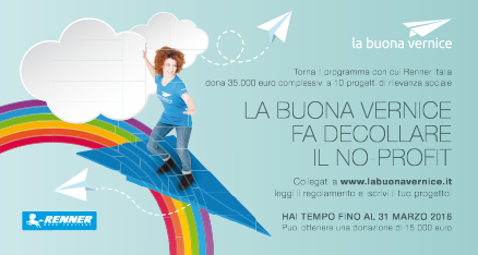 «È importante che la nostra Renner rimanga un sistema aperto – commenta l’amministratore delegato di Renner Italia, Lindo Aldrovandi -. Continuiamo a credere all’impresa intesa come ingranaggio della catena dei valori del territorio di riferimento. Con La Buona Vernice vogliamo essere funzionali alle decine di realtà del volontariato, della cultura e dello sport che ogni giorno riempiono di valore le nostre comunità. Contiamo di riuscirci anche nel 2016».