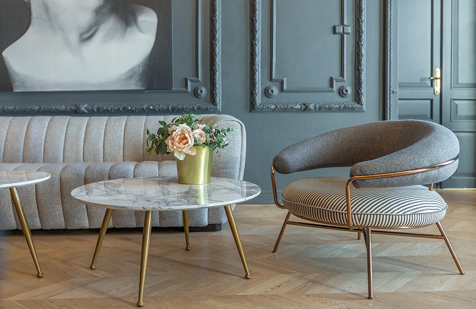 In un salotto dalle pareti lussuose e decorate si può smorzare l’opulenza comunicando comunque eleganza attraverso arredi di design contemporaneo. Le finiture metallizzate fanno da “ponte” tra i due mondi.