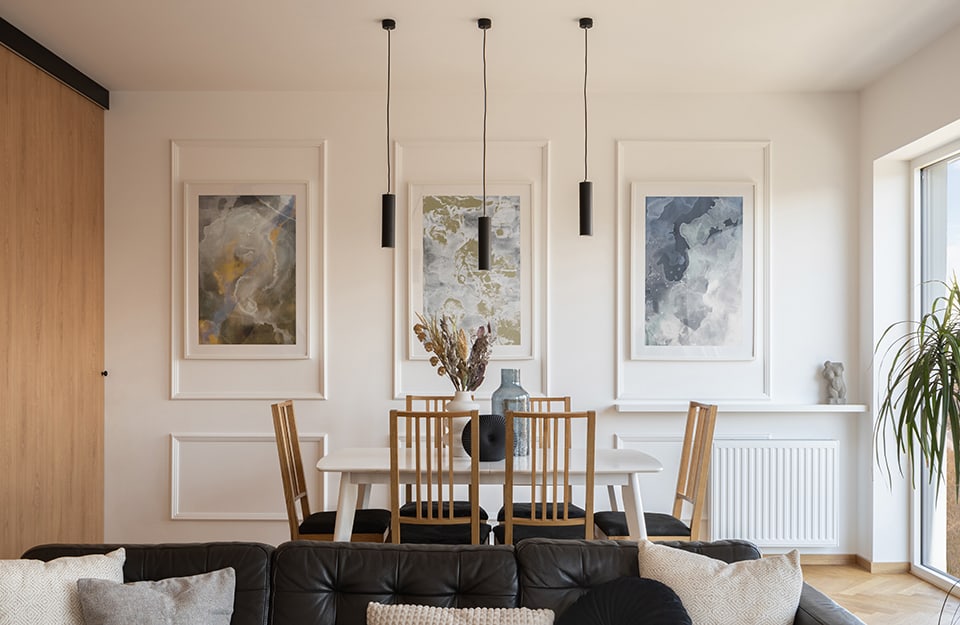 Una sala da pranzo con arredi moderni che ben si sposano con una parete impreziosita da cornici bianche che fanno risaltare i quadri.