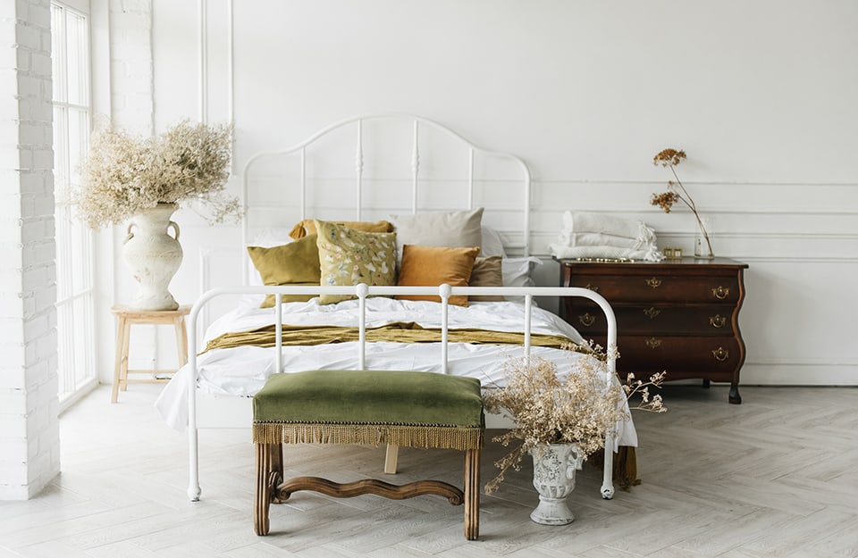 L’essenzialità del bianco si accende di fascino grazie all’accostamento tra mobili antichi e una struttura del letto moderna ed essenziale, che richiama però le linee curve degli arredi d’epoca. Dei vecchi vasi contrastano col tavolino rustico in legno naturale. A livello cromatico, il bianco fa risaltare i verdi e i marroni dei tessuti.