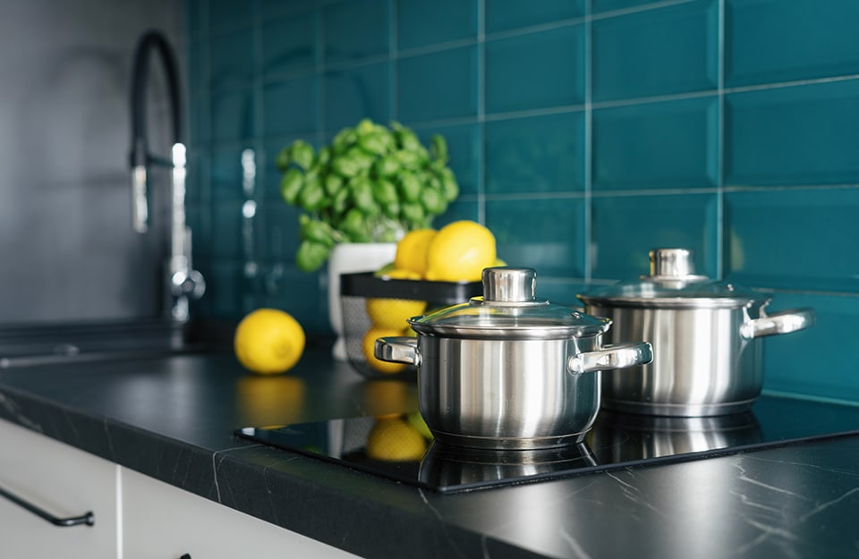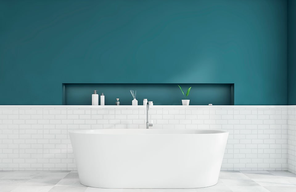 - Per le piastrelle: come rivestimento paraschizzi o come decorazione a parete, l’ottanio si abbina al bianco e al grigio (anche al legno naturale, per quanto riguarda il bagno).