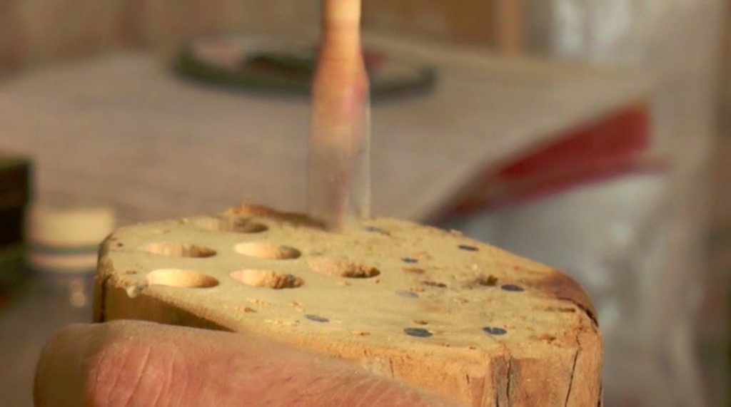 - Eliminiamo l’eventuale eccesso di impregnante depositato nei fori facendolo colare nuovamente nel barattolo (vedi video).