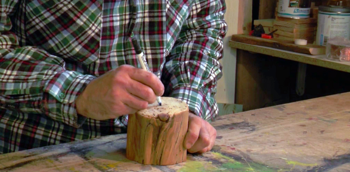 - Prendiamo l’impregnante per legno all’acqua (RM 1310) e verniciamo bene tutta la superficie del ciocco di legno, facendo attenzione a far penetrare il colore anche nei fori.