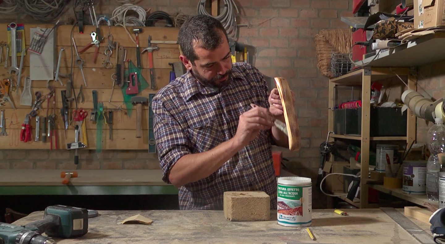 - Prendiamo la finitura effetto cera all’acqua (RC 2030) e verniciamo per bene il portaincenso.