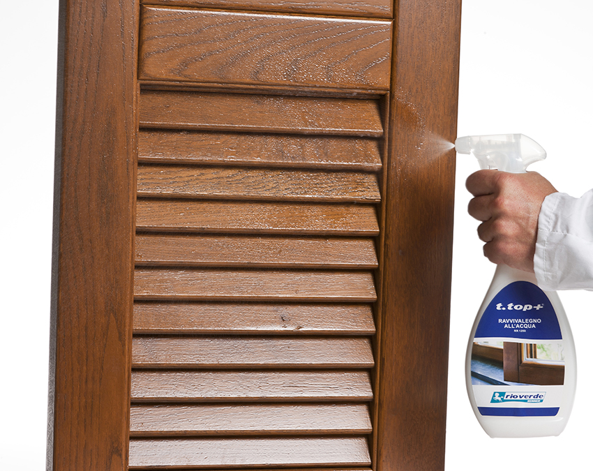 - Spruzza il ravvivalegno T.Top+. E, se accidentalmente il vaporizzatore indirizza il prodotto anche sul vetro, niente paura! Anche T.Top+ si asporta agevolmente durante la successiva operazione di stesura.