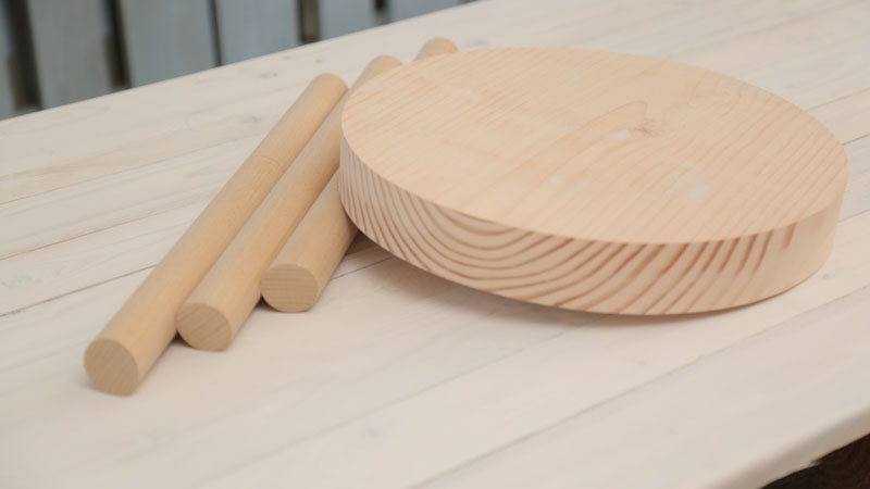 - Applicare la colla per legno sulle gambe e inserirle a pressione nei fori precedentemente ricavati nel disco