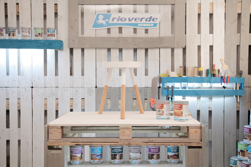 - Mescolare la Finitura all’acqua RP4060 (trasparente opaca) e stenderne una mano sulla parte bassa delle gambe dello sgabello