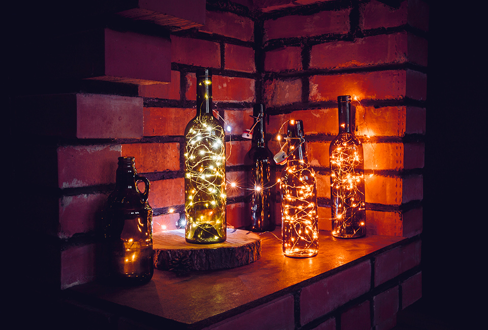 Si possono usare delle candele — in questo caso meglio optare per quelle bianche o rosse — o, se si preferisce, si possono usare le lucine al LED che, inserite nelle bottiglie di vetro vuote o nei barattoli, sembreranno delle costellazioni rubate dal cielo.