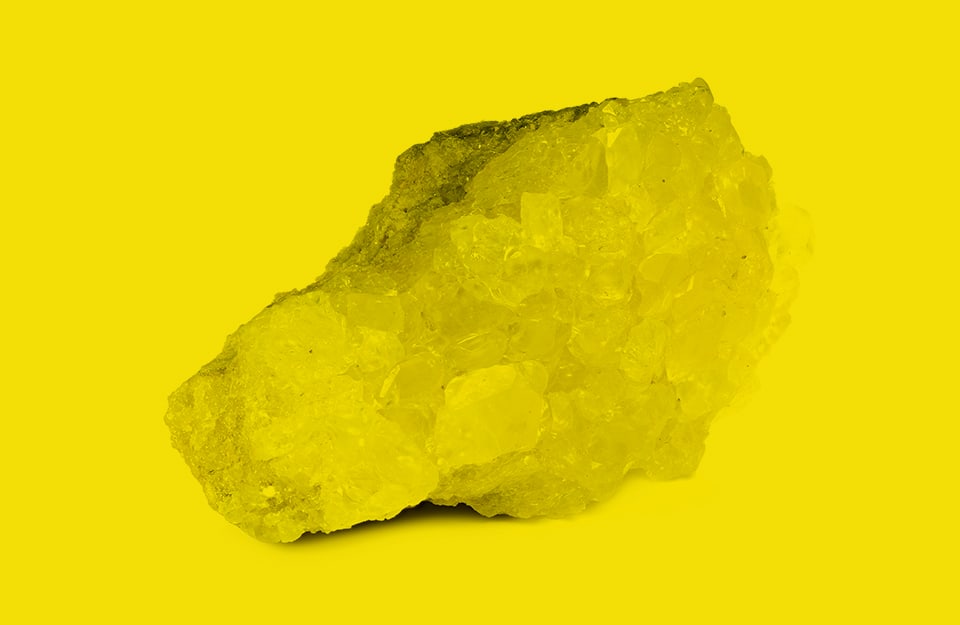 Il colore dello zolfo è un giallo pallido che rimanda a quello dei cristalli dell’omonimo elemento chimico. Il nome stesso dello zolfo pare derivi dall’arabo sufra, che significa, appunto, giallo.