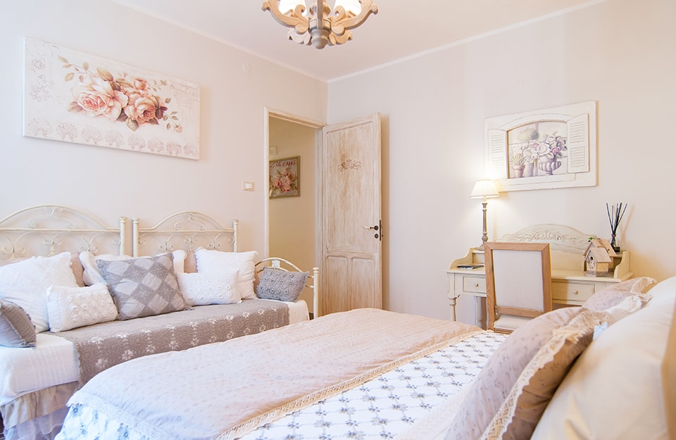 Camera da letto romantica con elementi nuovi in stile antico e arredi vintage restaurati.