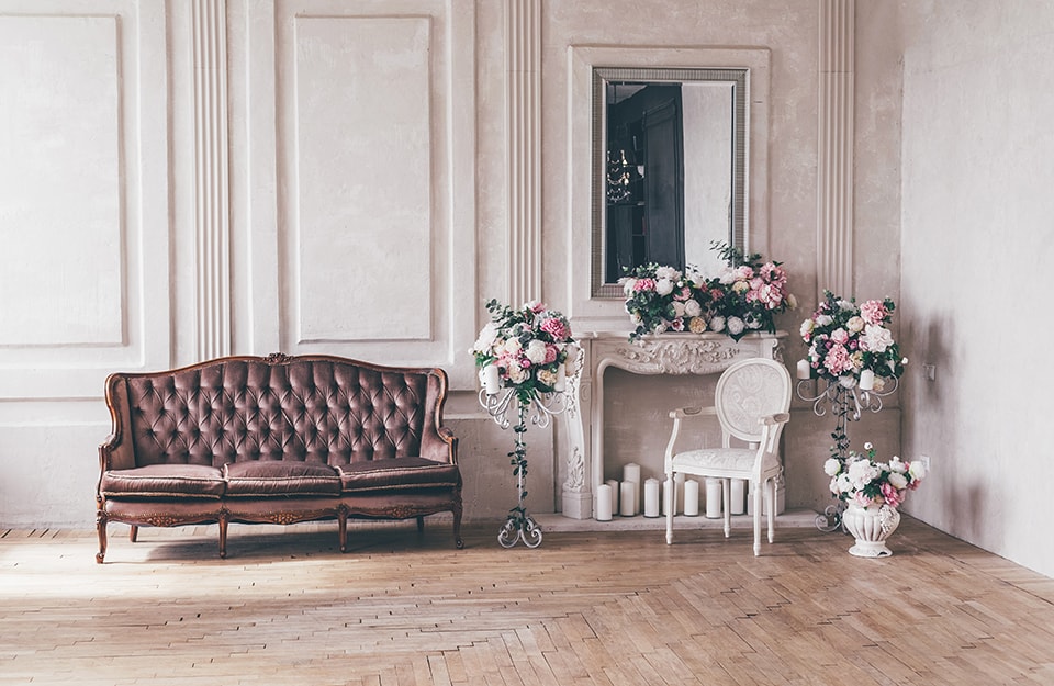 Seduta e sofà d’epoca, parquet, vasi e portavasi. Specchio con cornice metallica, pareti decorate con cornici geometriche, parquet e un tripudio di fiori.