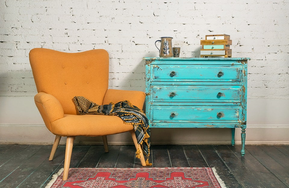 Una poltrone i stile scandinavo ben si accosta a un mobile antico assai vissuto per un angolino del salotto o dell’ingresso.