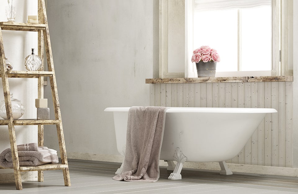 Un stanza da bagno. Notare la vasca in stile antico e la vecchia scala utilizzata come portaoggetti.
