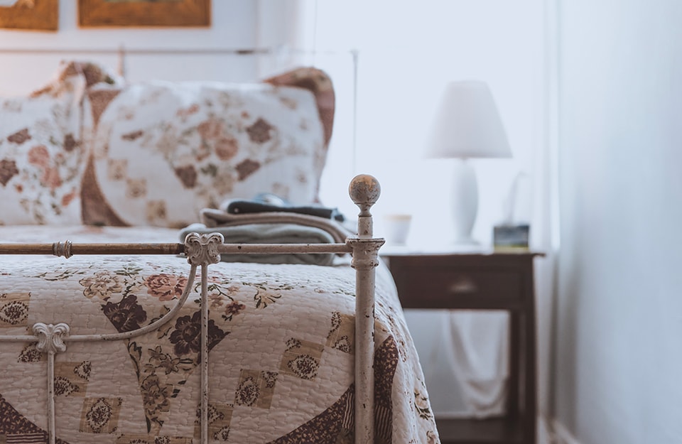 Un letto in ferro battuto consumato dal tempo diventa il protagonista di una camera.