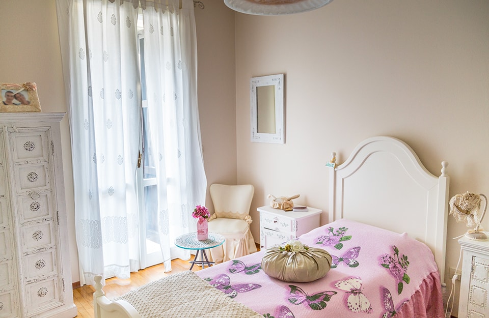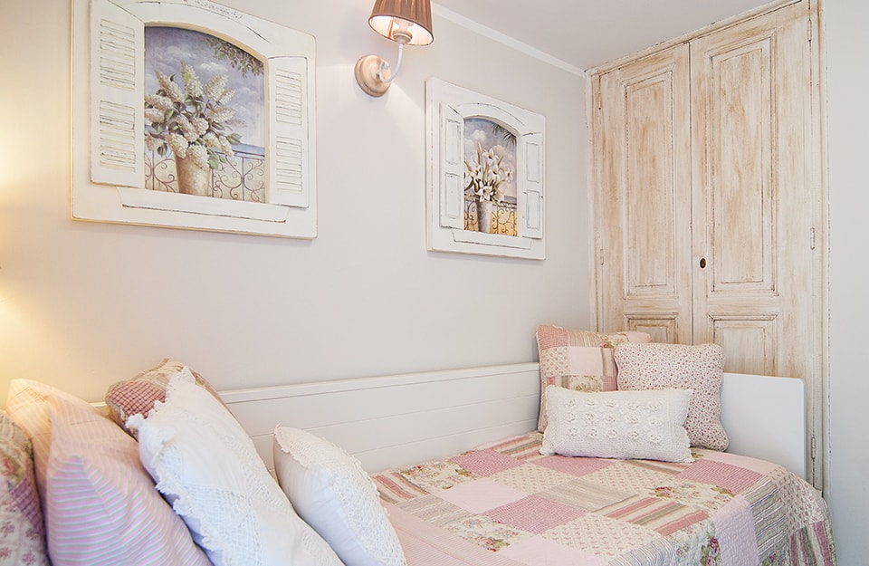 Cameretta in stile rustico-provenzale, con quadri trompe-l’oeil e un vecchio armadio a muro.