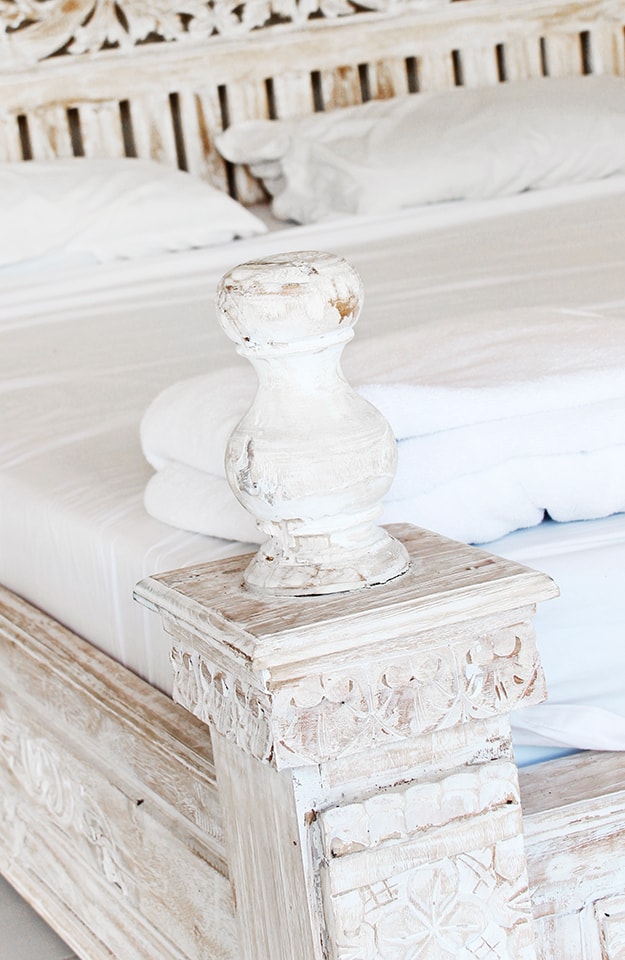 Un antico letto restaurato per esaltarne le linee e le decorazioni.